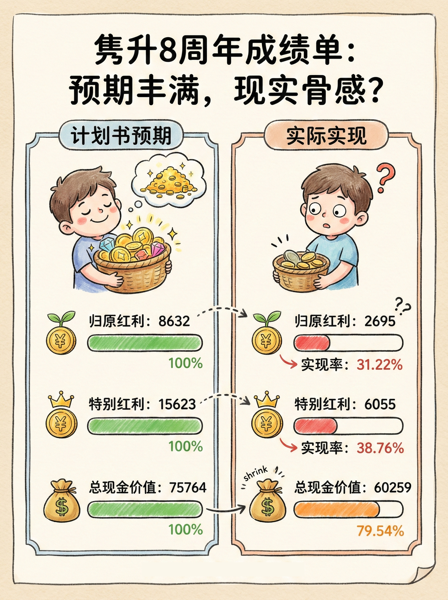 需留意,不同年份缮发的保单,目前已经达到的保单周年不同,实现率均不一样。趸交和期交保单的实现率也不同。想要知道自己保单的实现率,还是要通过周年通知书和“预期现金价值一览表”进行核对。