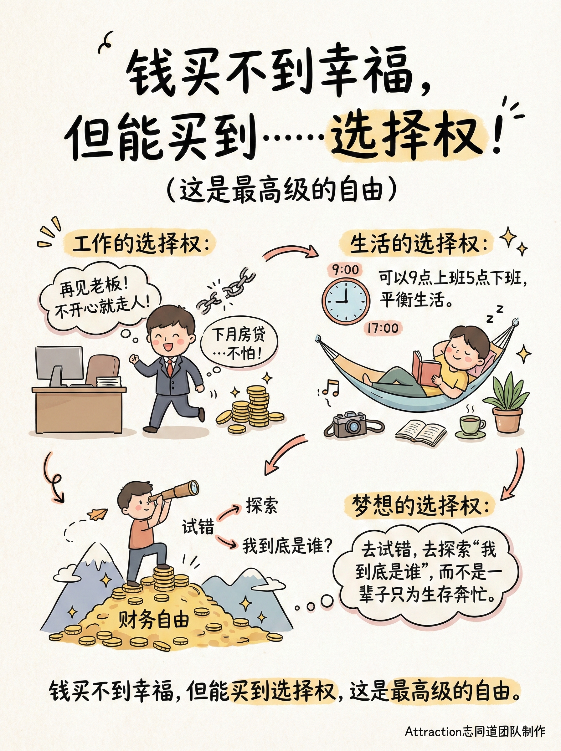 - 梦想的选择权:你想画画、写书、探险,或者做个不赚钱但有趣的公益?财务自由能托住你,让你去试错,去探索“我到底是谁”,而不是一辈子只为生存奔忙。