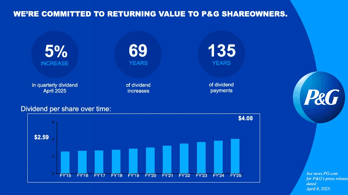 截至近年,宝洁的年化股息收益率大约在2.5%到3%之间,看起来不算特别高,但别忘了两件事:第一,这个数字每年都在增长,你今天买入的成本是固定的,但股息金额每年都在提高,几年后相对于你当初的买入成本,实际收益率会越来越高;第二,宝洁的股价同样在长期向上,资产增值和股息收益是双轮驱动的。