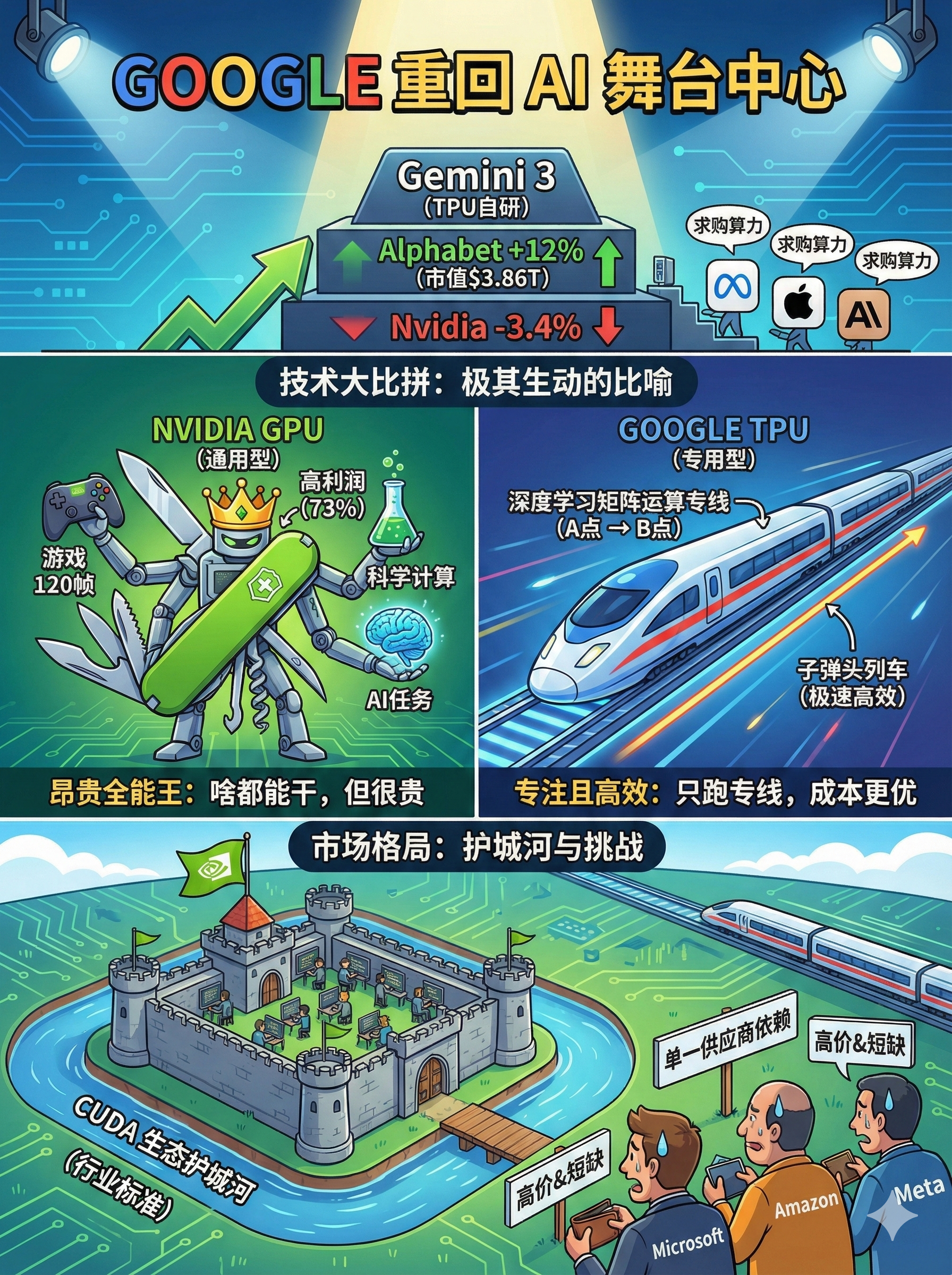 刚刚在读Barron's上关于Google用TPU挑战英伟达垄断的文章,做成了一张图片。我觉得除了投资之外,对我们也是有启发的。