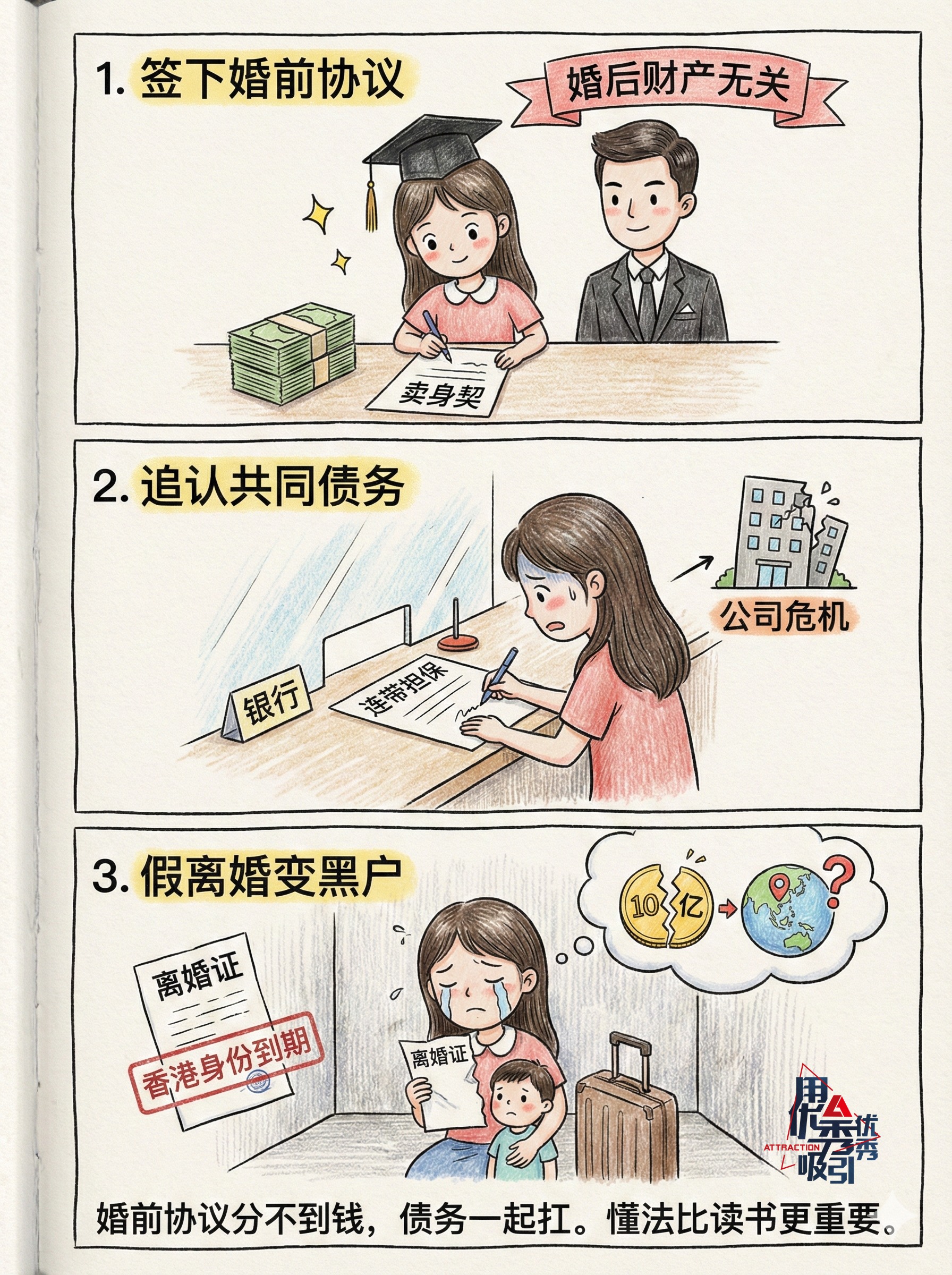 更荒诞的是,律师进一步了解后发现,她在婚前还签过一份“婚前协议”,文件是先生准备的。内容她几乎没看,完全信任丈夫。