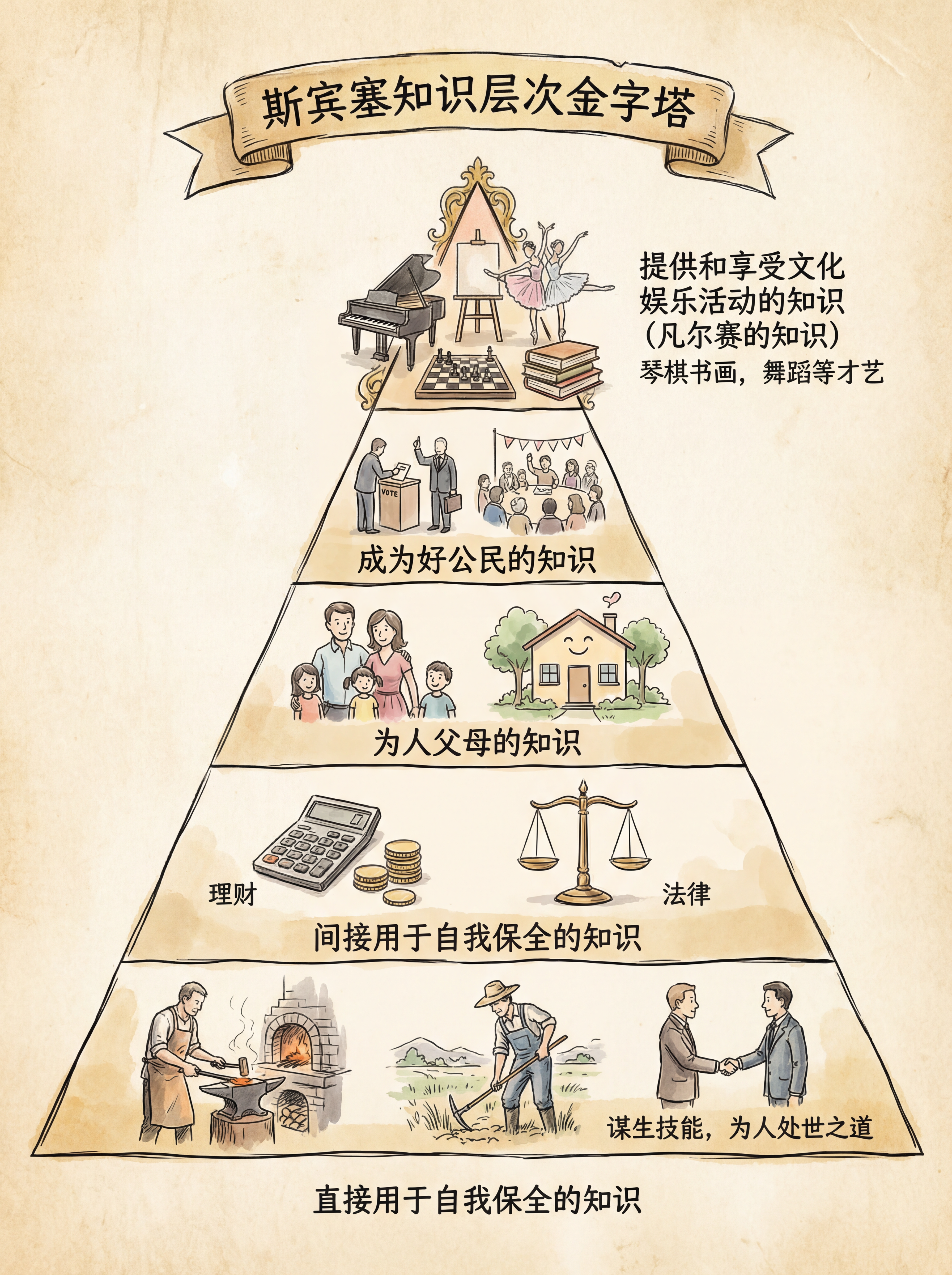 直接和间接用于自我保全的知识!包括,谋生技能、为人处世之道、理财和法律。