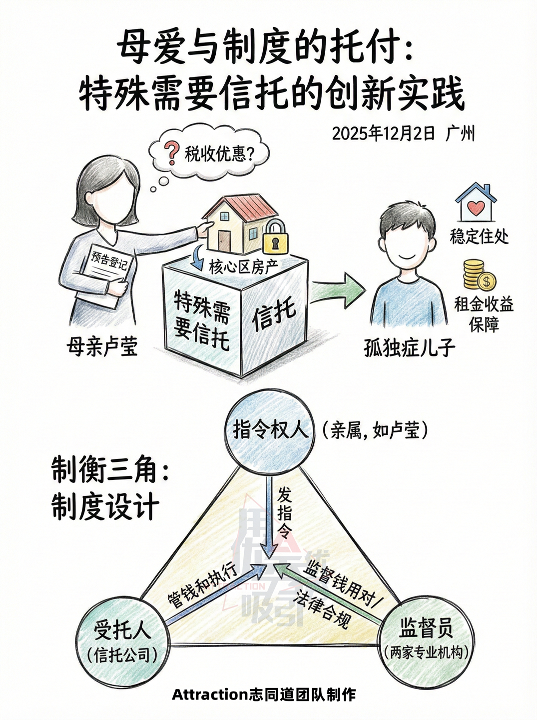 2025年12月2日,广州一位母亲卢莹,用“预告登记”把一套核心区房产塞进了特殊需要信托。她患有孤独症的儿子,未来有了稳定的住处和租金收益保障。这操作,没立刻过户,却用法律文书锁死了房产的未来归属。